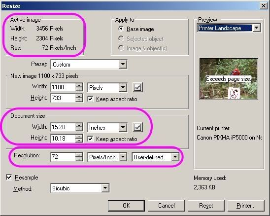 Open your image in PI, go to the "Resize" menu, you will see something like this, just click on the image below to see a larger view of it:
