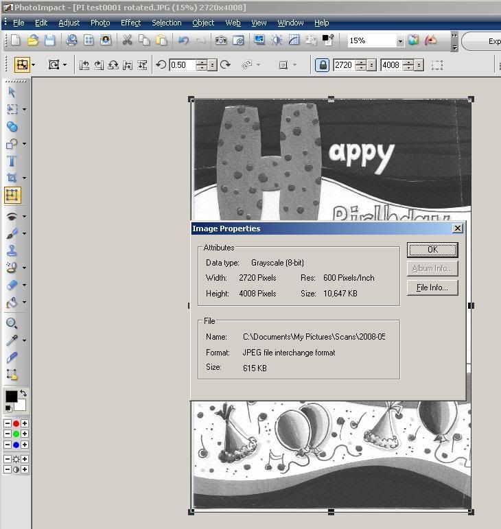 First of all, when I tested this in PI X3, the image resolution did not change after I rotated the image and saved.Frank wrote:I right clicked on the jpg and clicked 'Edit with PhotoImpact' that appears in the drop down menu. PhotoImpact then opens with the jpg in an 'inset' window in the editing field. I then clicked on 'Edit' in the top tool bar, moved the mouse pointer down to 'Rotate and Flip', at which time another menu opened to which I selected 'Rotate 180'. After the jpg rotated, I clicked the red x (close) in the top corner of the 'inset' window containing the jpg. A pop-up window appears saying 'Save changes to (jpg)' with 3 buttons - Yes, No, Cancel. I click 'Yes' and the window closes .... That's it ....heinz-oz wrote:Can you give me a step by step description of what you did to rotate the page in PI?
